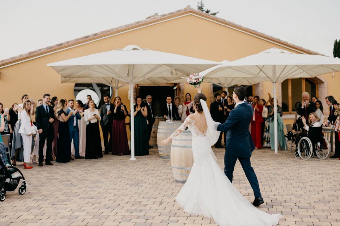 La recepción fué en el exterior, aprovechando el buen  clima y las fantásticas vistas del entorno. La verdad es que durante todo el evento en la masía Can Bonastre se aprovecharon muy bien los espacios. La cena, el baile… todo estuvo preparado para que pasaran una noche inolvidable. Con tirada de ramo incluida!