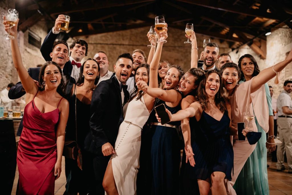 Haz partícipes en la ceremonia a tus invitados. Las dinámicas de juegos o los bailes grupales siempre animan. No tenéis que esperar a la hora del baile, sorpréndeles en medio de la cena y haz que todo el mundo se ponga a bailar.