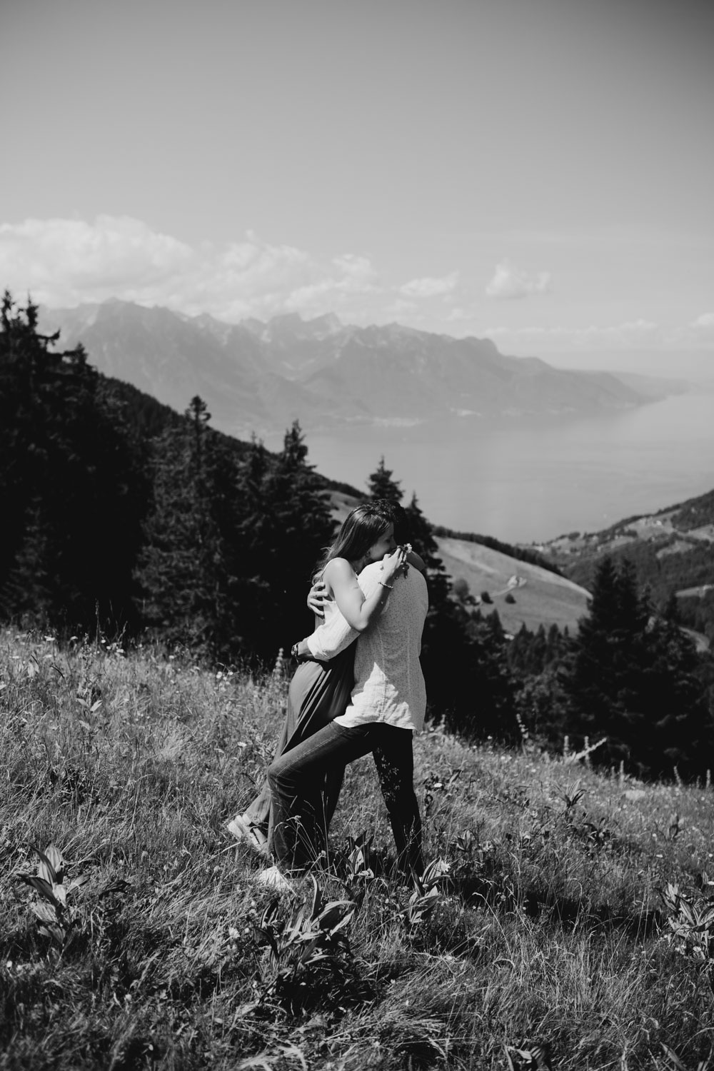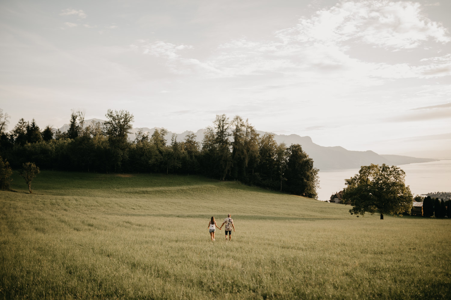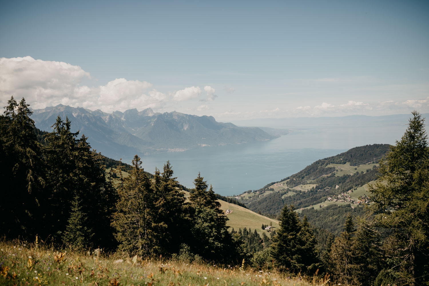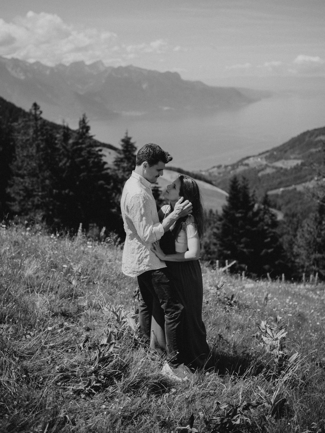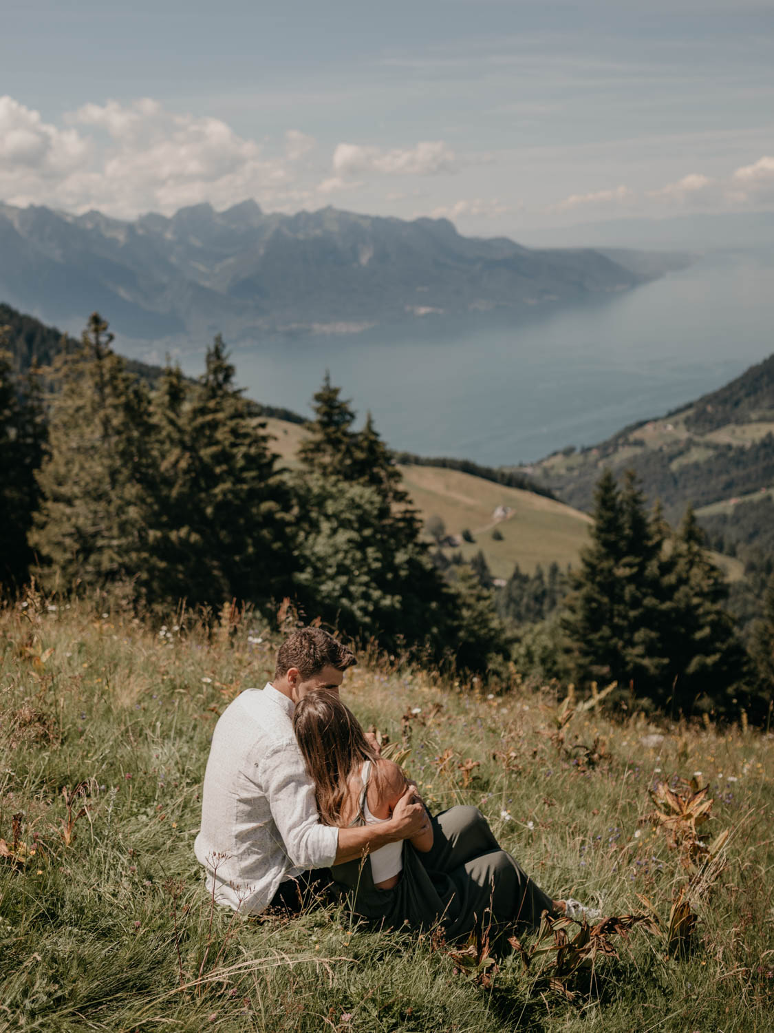 Para el reportaje fuimos hasta la zona de Montaña de Montreux, en los Alpes berneses de Suiza. La naturaleza, el lago y el cielo se mezclaron con la naturalidad de la pareja. La complicidad entre los dos se refleja en cada fotografía y los votos, solo han hecho consolidar un compromiso y amor que se nota a leguas en cuanto conoces a Adriana y Esteve.