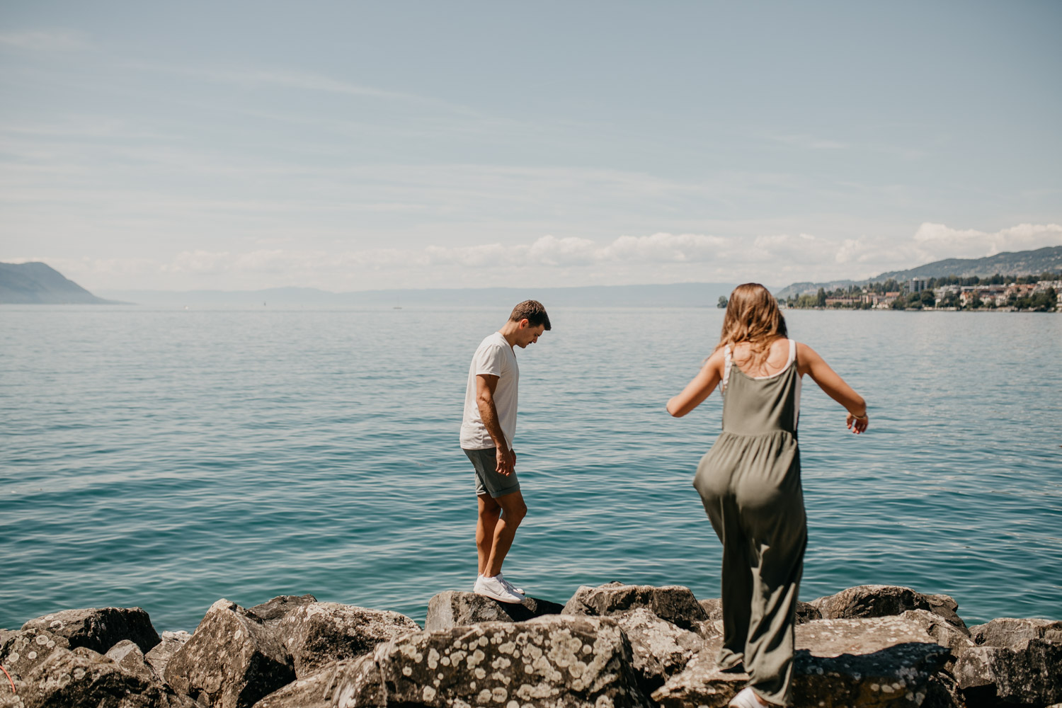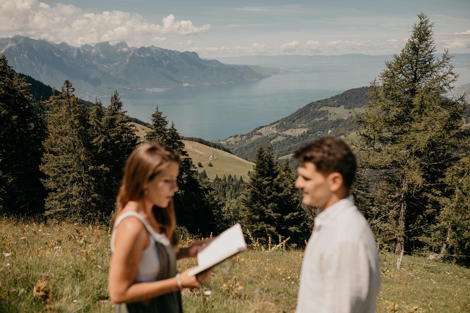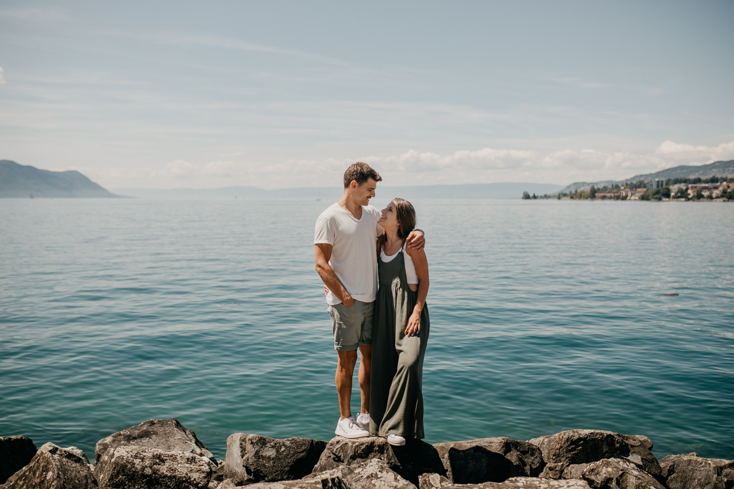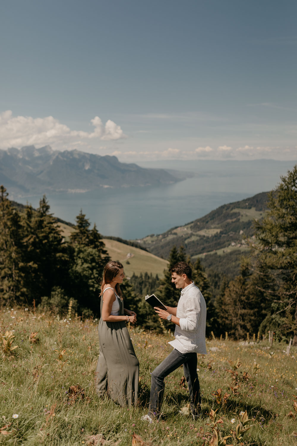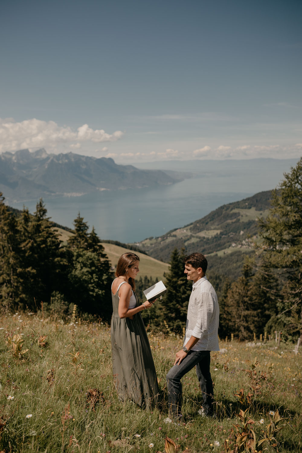 Para el reportaje fuimos hasta la zona de Montaña de Montreux, en los Alpes berneses de Suiza. La naturaleza, el lago y el cielo se mezclaron con la naturalidad de la pareja. La complicidad entre los dos se refleja en cada fotografía y los votos, solo han hecho consolidar un compromiso y amor que se nota a leguas en cuanto conoces a Adriana y Esteve.