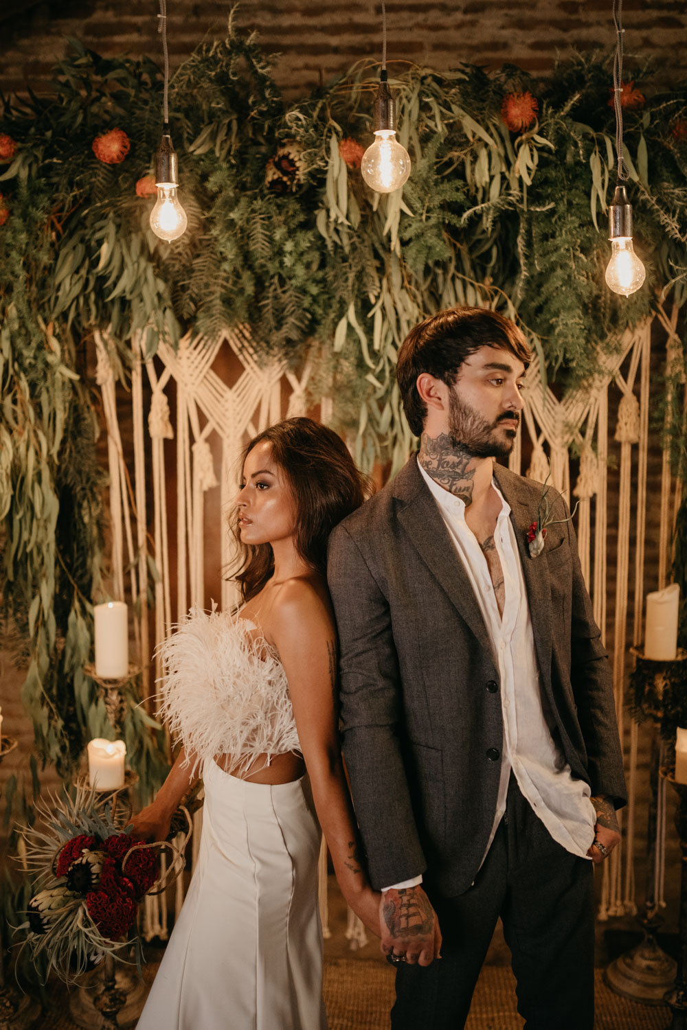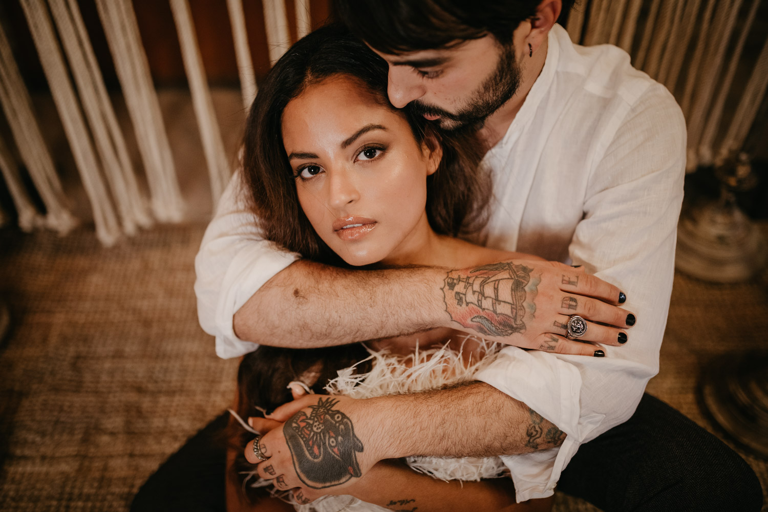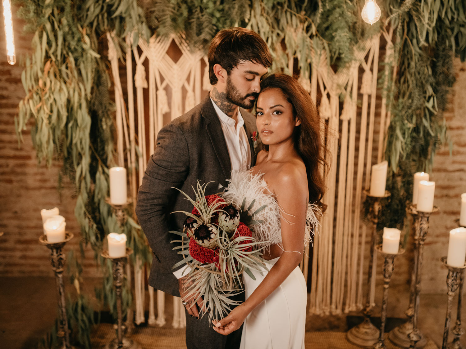 En esta nueva sesión fotográfica hemos querido mezclar la decoración Boho con un toque Rock. Crear un ambiente íntimo y muy sensual, donde capturar la complicidad y los momentos únicos de la pareja. Una sesión de boda intima donde los protagonistas son los novios. En un decorado donde la luz juega un papel fundamental para captar la pasión de los dos.
